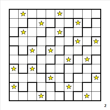 Place an equal number of stars (indicated by the number next to the puzzle) on every row, in every column and in all larger areas such that two stars never touch, not even diagonally. Star battle is a binary determination puzzle in which the position of stars located in a grid must be determined. Another name for this puzzle type is dopplestern. In some cases, the thick area boundaries extend outside the diagram, or go through rows or columns without. I'm new to this type myself even as a solver, so the puzzle may leave a lot to be desired.
